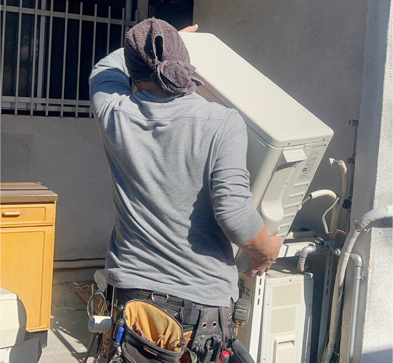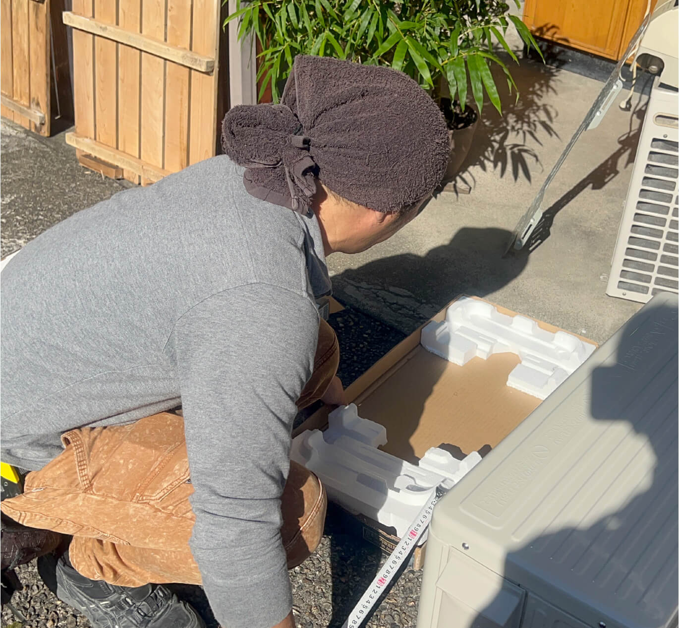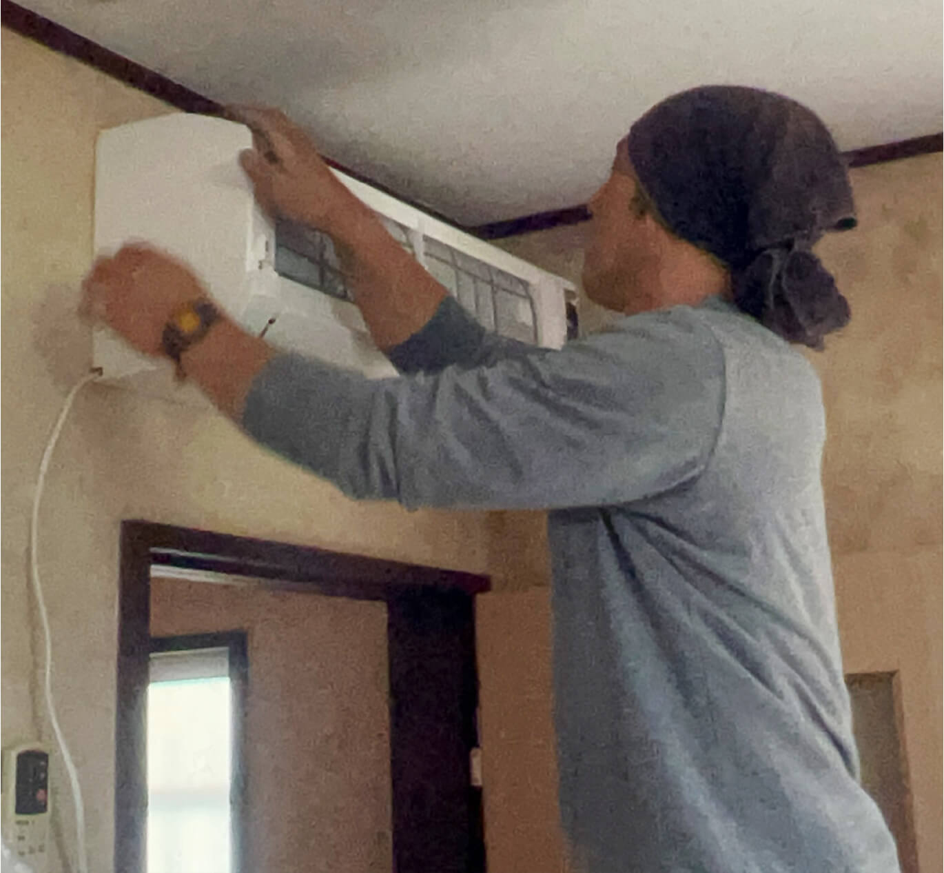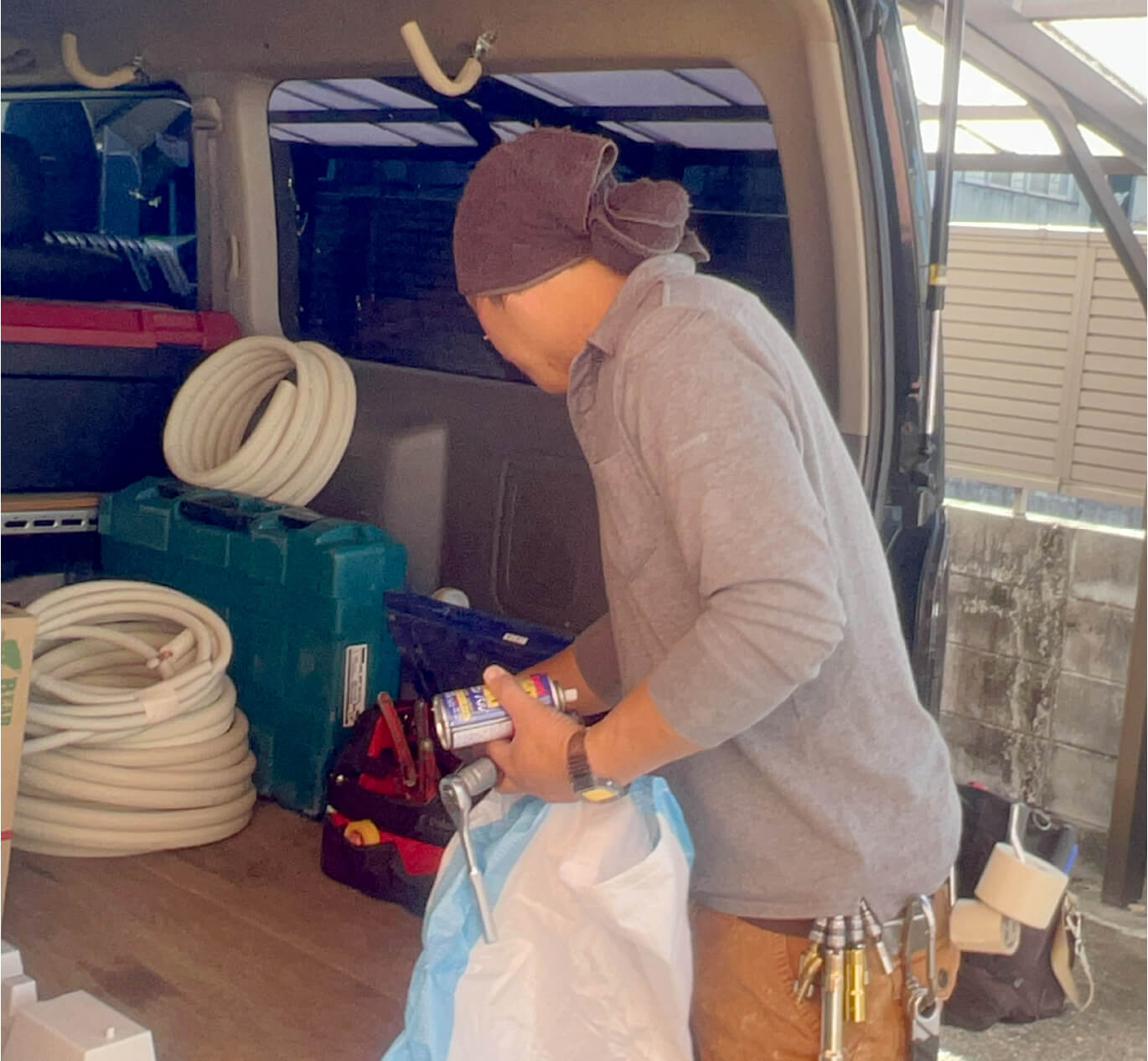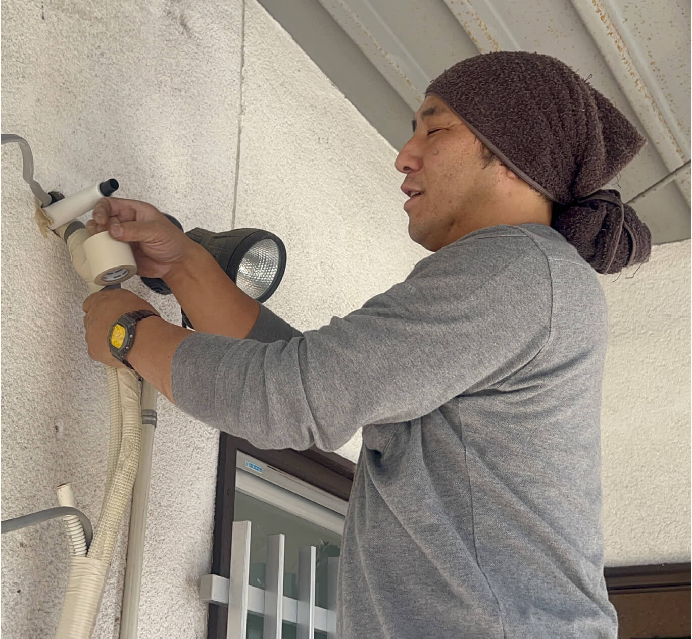 エアコンを取り付けたり入れ替えたりする工事なので、自分達はエアコンの効いた部屋で作業できないのが結構辛いですね(笑)